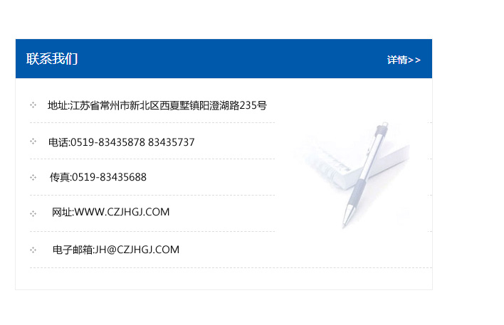 傳真:0519-83435688    郵編:213135    網址:WWW.czjhgj_com.pm1188.com    電子郵箱:JH@czjhgj_com.pm1188.com